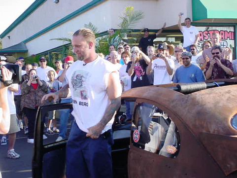 The final part of the filming was the icing on the cake. The plan was for Jesse to pull in to the local VW cruise night at Nicks Burgers in the Sour Kraut. As luck would have it, Fullerton's finest was in attendance as well and wanted no part of a drag car being on the street. Right in front of the crowd the red and blue lights flashed and Jesse pulled over across the street. No paperwork, no license plates, no headlights, brake lights, etc, they really could have had a field day with him, but after a tense 10 minutes or so and some conversations with the producers, he was written a small citation and was allowed to drive it across the street into the parking lot of the burger joint where the crowd was waiting to meet and greet the man and his machine. A lot of folks thought the police deal was staged, but it was absolutely not. But it did add a lot to the excitement of the scene and to the show as a whole. If you google "Monster Garage Sour Kraut" I am sure you can pull up the show online. It is well worth the watch I can assure you.